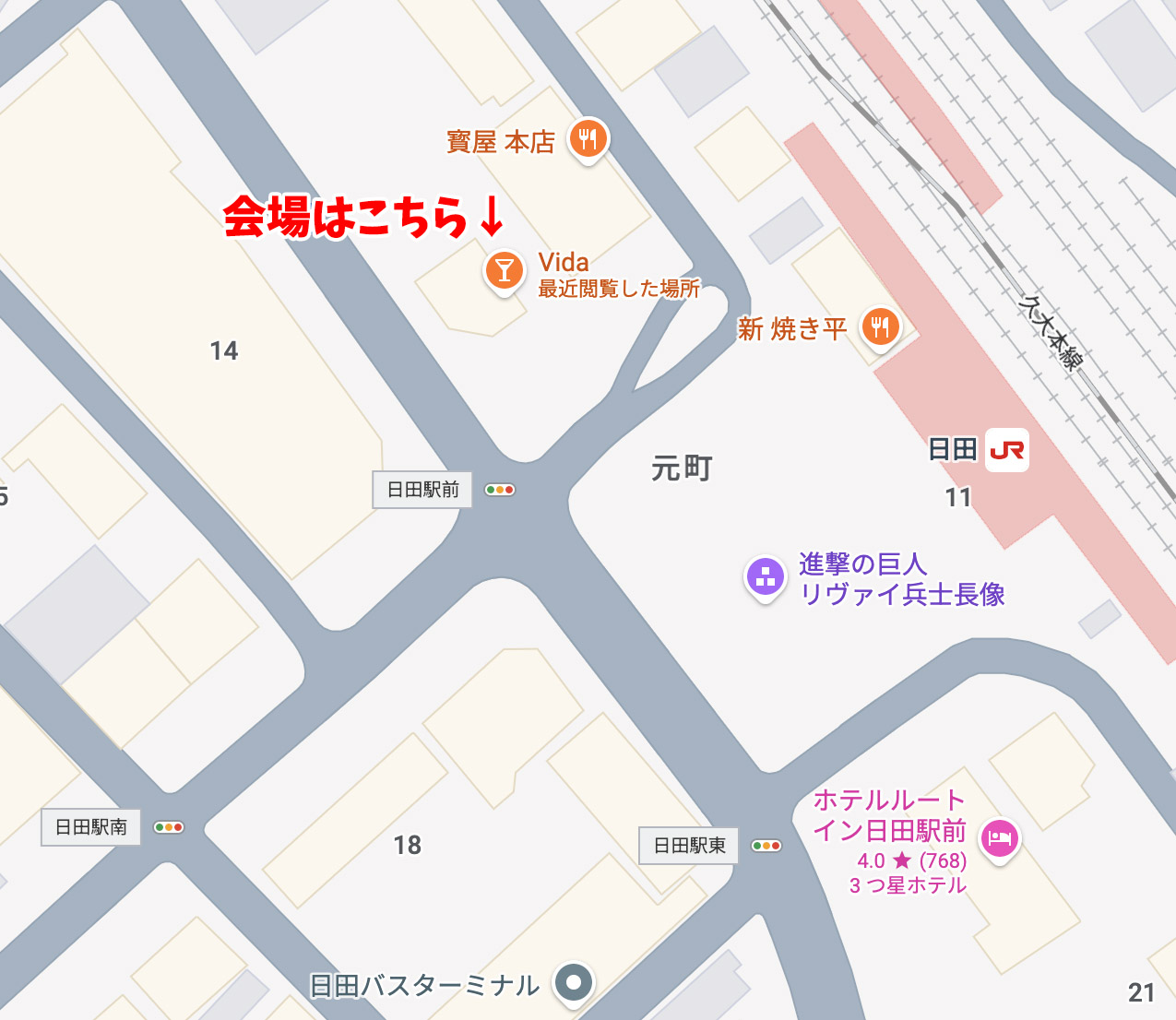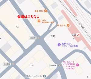 会場は日田駅前からすぐの場所にあるダーツバー「Vida」!
